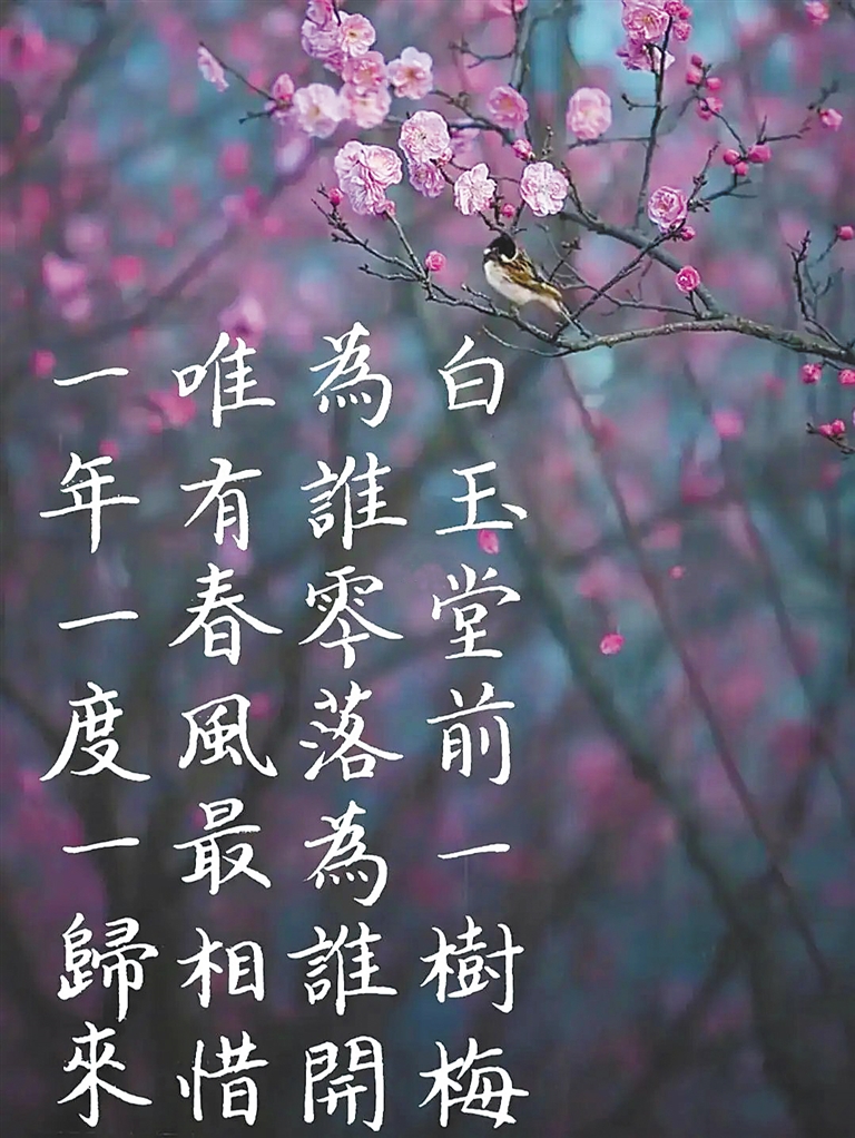 王安石有集句诗《梅花》:“白玉堂前一树梅,为谁零落为谁开。唯有春风最相惜,一年一度一归来。”这四句诗,分别摘自唐代蒋维翰《春女怨》、唐代严恽《落花》、唐代杨巨源《折杨柳》及宋初詹茂光妻所作《寄远》。王安石借前人的诗句,写梅花开了又谢,在花木凋零之后又迎明媚春光,既有原诗句所包含的情绪色彩和象征意蕴,又带有个人的洒脱自如,进入了更高的境界。