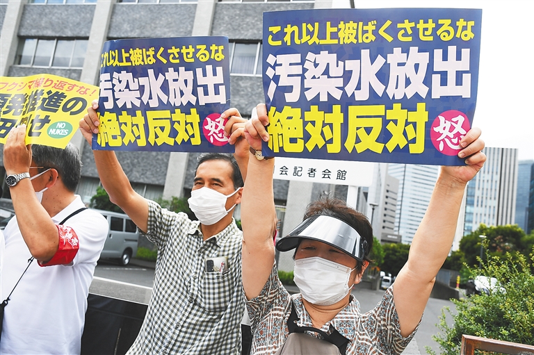 “不许排放核污染水!”“要听渔民的声音!”“不许污染大海!”22日,许多日本民众冒雨在东京的日本首相官邸前高呼口号,抗议政府当天上午决定8月24日启动福岛核污染水排海。