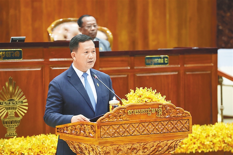 8月22日,柬埔寨新一届政府首相洪玛奈在首都金边向国会议员发表讲话。