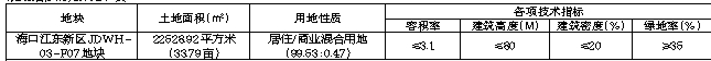 一、出让宗地的基本情况和规划指标要求:(一)基本情况及宗地净地情况。本次挂牌出让的用地位于海口市江东新区JDWH-03-F07地块,土地面积为22528.92平方米(合33.79亩),土地用途为城镇住宅/零售商业混合用地[其中城镇住宅用地占比99.53%(拆迁补偿安置住宅用地),零售商业用地占比0.47%],土地出让年限为城镇住宅70年、零售商业用地40年。目前地块安置补偿落实到位、地上附着物已清表、土地权利清晰、无法律经济纠纷、土壤无污染,具备动工开发必需的条件。(二)主要规划指标。海口市江东新区JDWH-03-F07地块用地的规划指标情况详见下表: