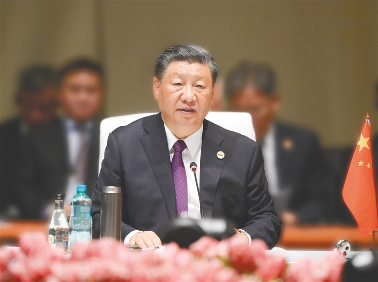 习近平最后强调,金砖事业秉持国际道义,造福五国人民,必将行稳致远,为促进世界和平和发展作出更大贡献。中方愿同金砖伙伴一道,秉持人类命运共同体理念,加强战略伙伴关系,深化各领域合作,以金砖责任应对共同挑战,以金砖担当开创美好未来,共同驶向现代化的彼岸!