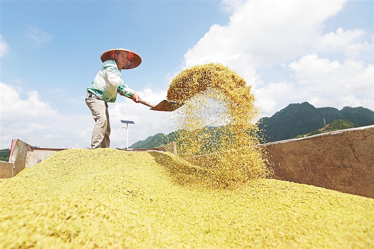 图为农民在贵州省黔东南苗族侗族自治州岑巩县注溪镇周坪村杂交水稻制种基地将收割的水稻装车。