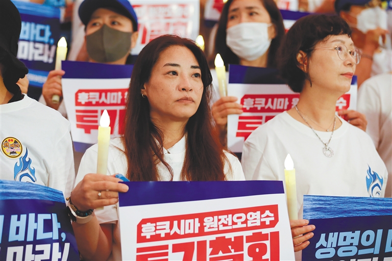 参加集会的市民手中高举“誓死反对(核污染水)排海”“大海不是日本的核垃圾场”“谴责杀死海洋的日本政府”等标语,面向日本驻韩国大使馆齐声高呼“(韩国)国民愤怒不安,立即撤回核污染水排海决定”等口号。