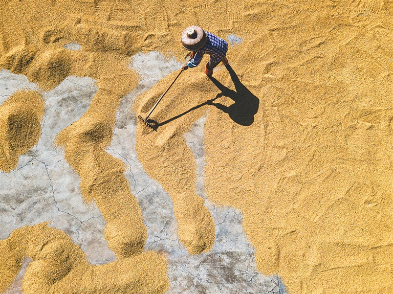 进入处暑节气,琼海晚稻陆续成熟开始收割,当地农民趁着晴好天气加紧晾晒稻谷,房前屋后一派繁忙的晒丰收景象。