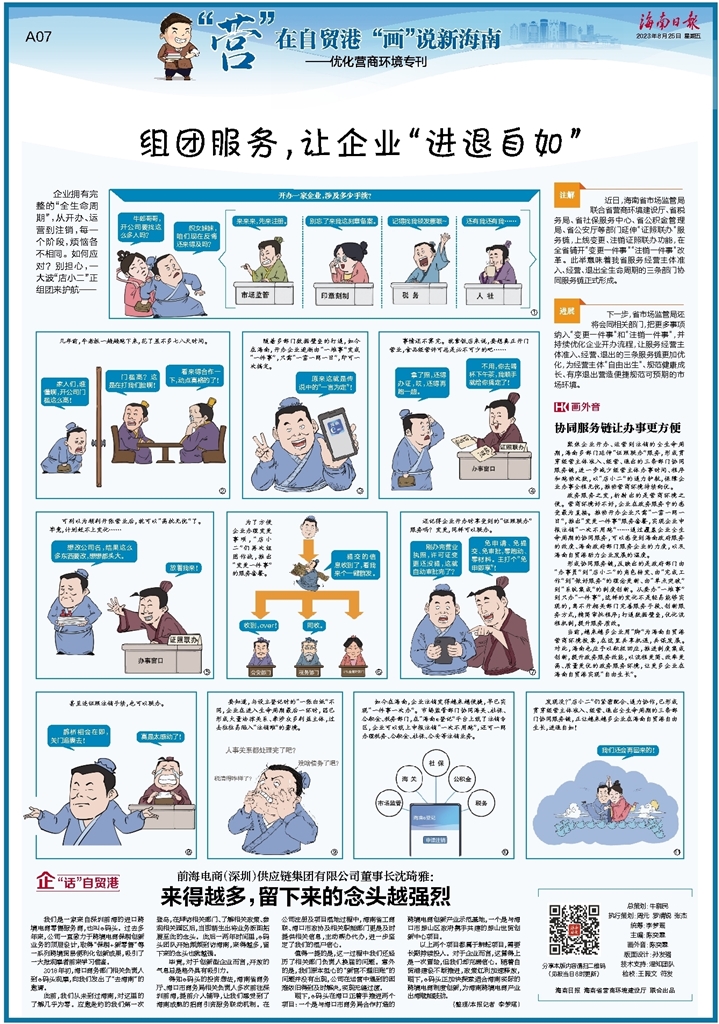 聚焦企业开办、运营到注销的全生命周期,海南多部门延伸“证照联办”服务,形成贯穿经营主体准入、经营、退出的三条部门协同服务链,进一步减少经营主体办事时间、程序和跑动次数,以“店小二”的通力护航,保障企业办事全程无忧,推动营商环境持续向优。
