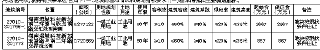 (二)其他规划控制条件。27010-201768-1号地块建筑退道路、绿化带红线距离:东侧退防护绿地12米,北侧防护绿地12米;建筑退用地界线距离:南侧退9米,西侧退9米,应符合日照、消防、视觉卫生、防灾、抗震等要求。27010-201773号地块建筑退道路、绿化带红线距离:东侧建筑退绿化带红线距离12米;建筑退用地界线距离:应符合日照、消防、视觉卫生、防灾、抗震等要求。27010-201768-1、27010-201773号等2宗地块建筑间距满足国家、海南省的相关规定;机动车停车位按不少于0.15个/100平方米计容建筑面积标准配建。工业项目所需行政办公及生活服务设施用地面积不得超过工业项目总用地面积的7%,且建筑面积≤工业项目总建筑面积的15%。(三)宗地净地情况。27010-201768-1、27010-201773号等2宗地块土地征收工作已完成,土地权属清晰,土地补偿款、安置补助费、青苗补助费和地上附着物等款项均已补偿到位。目前该2宗地的地上的附着物已清表、无法律经济纠纷、土地开发利用规划条件明确、符合土壤环境质量要求。地块周边可以满足施工建设所需的水、电供应,相关设备、机械可以进场施工,具备净地出让的条件。经核查,该2宗地块不属于非法占地、违法建设行为已经处置到位并组织供应的土地。经查询全国污染地块土壤环境管理系统,上述地块不在系统污染或疑似污染地块范围内。二、本次国有建设用地使用权挂牌出让设有底价,按照出价最高且不低于底价的原则确定竞得人。三、开发建设要求:(一)按照《海南省建设用地出让控制指标(试行)》有关规定,该宗地块设定出让控制指标,具体如下:27010-201768-1号地块项目达产时间为签订《国有建设用地使用权出让合同》后的第5年。27010-201773号地块项目达产时间为签订《国有建设用地使用权出让合同》后的第3年。27010-201768-1、27010-201773号等2宗地块在约定达产时间内投资强度不低于300万元/亩;自项目达产之日起税收不低于 30 万元/亩/年,产值不低于500万元/亩/年。项目按 4 亩安置1名失地农民就业,在同等条件下优先招录本市县户籍居民。招录条件按人事劳动部门规定执行,同工同酬并遵照乙方规章制度管理。以上控制指标按规定列入《海南省产业项目发展和用地准入协议》,属于协议内容的组成部分。(二)其他开发建设要求。1.竞得人取得土地使用权后,应严格按照规划设计要求和《国有建设用地使用权出让合同》的约定进行开发建设。涉及水务、绿化、环保、消防、交通管理等的设计施工,应符合国家和海南省的有关管理规定。2.涉及装配式建筑的,按照我省装配式建筑相关规定和澄迈县住房和城乡建设局相关要求执行。3.经查询海南省国土空间基础信息平台(公众版),上述2宗地块位于地质灾害非易发区,无需开展地质灾害危险性评估。4.竞得人应在按现状交地后三个月内开工建设,按海南省住房和城乡建设厅发布的《建设工程文明施工标准》(琼建定〔2016〕299号)在宗地范围内修建围墙。四、竞买申请:(一)竞买资格及要求。1.中华人民共和国境内外的自然人、法人和其他组织均可参加竞买(法律另有规定的除外)。属境外机构(含港、澳、台地区)申请参加竞买的,按照规定需要提交市场监督管理部门核发的《营业执照》。本次挂牌出让不接受联合竞买。2.失信被执行人不得参加本次竞买。3.根据海南老城科技新城入驻要求,竞买人及申请项目须符合海南老城科技新城产业规划以及准入条件。4.具有下列行为的自然人、法人和其他组织不得参加本次挂牌出让:(1)在澄迈县范围内有拖欠土地出让金的行为,并未及时改正的;(2)在澄迈县范围内有闲置土地,违法利用农村集体土地建设商品住房、擅自改变土地用途等违法行为,并未及时改正的。(二)交易资料获取方式。本次挂牌出让的详细信息和具体要求,见挂牌出让手册及其他相关文件。手册和文件可从海南省建设用地使用权和矿业权网上交易系统(网址:http://lr.hainan.gov.cn:9002)查看和打印。也可以到澄迈县土地交易所(澄迈县金江镇文化北路110-4号)咨询和领取。(三)竞买申请方式。本次交易活动竞买申请环节采取线下方式进行,有意竞买者请于2023年8月25日09时00分至2023年9月22日16时00分到澄迈县土地交易所提交书面申请,不接受电话、邮寄、口头等其他形式的申请。竞买申请地点:澄迈县土地交易所(澄迈县金江镇文化北路110-4号)。(四)竞买保证金。竞买申请人在竞买报名时须向指定账户足额缴存竞买保证金或使用银行保函方式提供竞买保证金。缴存竞买保证金的币种为人民币,不接受外币,且不属于银行贷款、股东借款、转贷和募集资金所得,并出具承诺。竞买保证金到账截止时间为:2023年9月22日16时00分(北京时间)。竞买人使用银行保函方式缴纳竞买保证金的,保函应为不可撤销、见索即付保函,保函担保金额应不少于全额土地竞买保证金,保函的保证期限应当自保函开立之日起至招标拍卖挂牌交易活动结束后不少于60日,保函需在保证金交纳截止时间前2个工作日内送达澄迈县自然资源和规划局。(五)资格确认。经审核,竞买申请人符合竞买资格,且竞买保证金或银行保函已按要求交纳的,澄迈县自然资源和规划局将发放《竞买资格确认书》,确认其获得竞买资格。竞买资格审核时间:2023年8月25日09时00分至2023年9月22日17时30分(北京时间)。五、挂牌报价时间及地点:(一)本次交