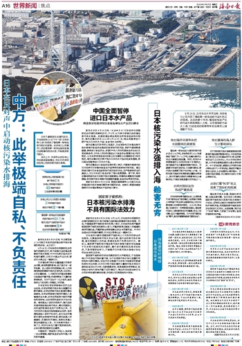 8月24日,日本政府无视国际社会的强烈质疑和反对,单方面强行启动福岛核事故污染水排海,中方对此表示坚决反对和强烈谴责,已向日方提出严正交涉,要求日方停止这一错误行为。