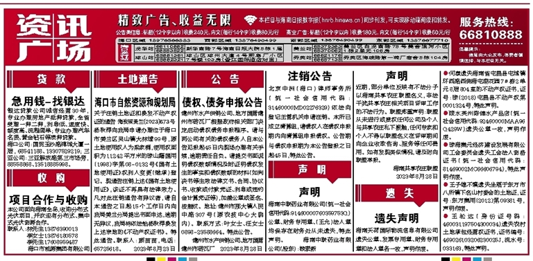 杨秋萍向我局申请办理位于海口市美兰区灵山镇大林墟99号,原土地使用权人为梁家桐,使用权面积为112.42平方米的琼山籍国用〔1998〕字第08-0132号《国有土地使用证》权利人变更(继承)登记。现通告注销上述《国有土地使用证》,该证不再具有法律效力。凡对此注销通告有异议者,请自本通告之日起15个工作日内向我局美兰分局提出书面申述,逾期无异议,我局将依法给杨秋萍换发上述宗地的《不动产权证书》。特此通告。联系人:颜苗苗,电话:65725618。 2023年8月23日