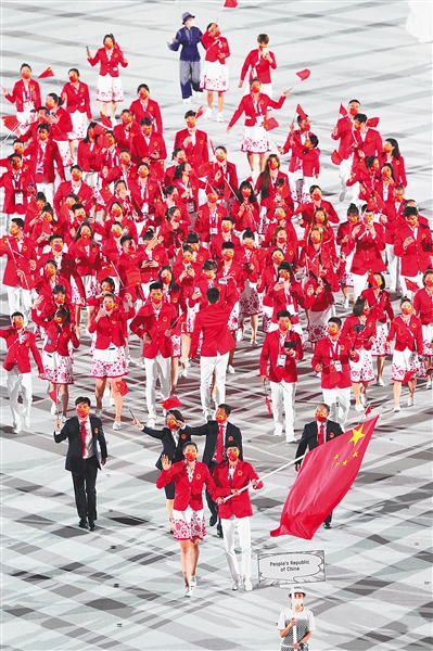 在2021年东京奥运会上,中国体育代表团的领奖服色调以红、白为主,在设计上有许多留白,白色为上衣的主色调。在衣领设计上,类似唐装的圆立领充分彰显了中国风范。