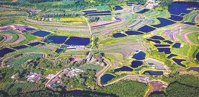 十多年过去了,我无时无刻不惦记着那片梯田,尤其想弄清楚梯田的具体位置。今年5月29日,我又乘飞机去海花岛拍摄游客高空跳伞的画面。返程时,飞机穿越春江水库后,窗外的美景像巨大的磁场紧紧吸引着我的目光。金黄色的梯田,一圈圈、一环环,秀出美丽的曲线。分布在梯田四周和中间约200个大大小小的鱼塘,仿佛是镶嵌在梯田里的一块块翡翠,斑斓多姿、光影澹澹。