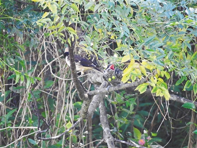 “当时我在五源河国家湿地公园下游的生态塘进行日常巡护监测,听到一阵阵黑领椋鸟的鸣叫声。循着黑领椋鸟的声音,我发现一只噪鹃跟两只黑领椋鸟在一株苦楝树上。”陈创林告诉海南日报记者,起初自己以为这是两种鸟在争夺地盘,通过相机观察发现,个头大只的噪鹃幼鸟不会飞,还不停地扇动翅膀、张大嘴巴,围着小小的黑领椋鸟发出叫声。