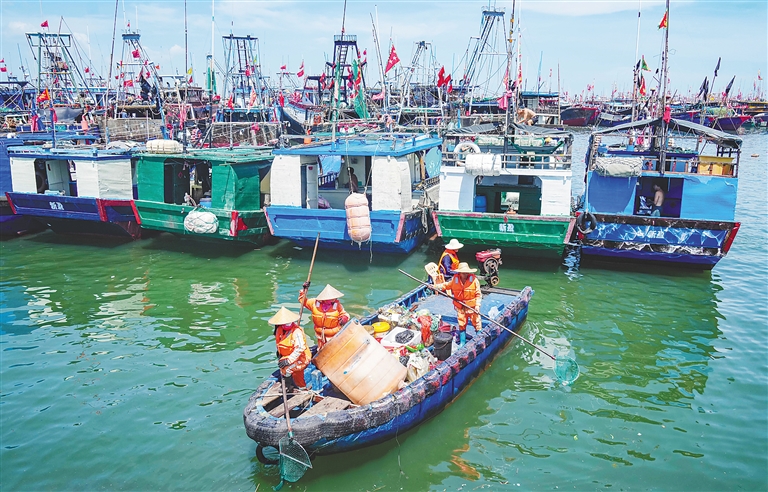 近日,在临高县新盈镇新盈中心渔港,海上环卫工人在打捞水上垃圾。随着捕捞生产活动有序开展,进出该港口的渔船增加,海上垃圾也随之增多,海上环卫工人加紧打捞,以维护港口的保洁。
