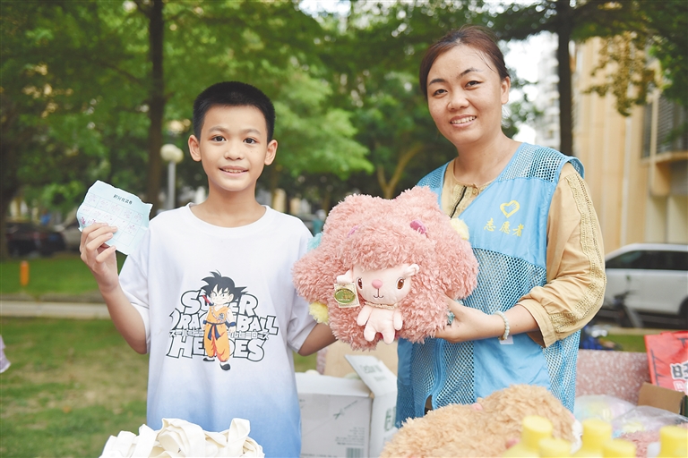 从兑奖处堆放的洗衣粉、笔记本、雨衣等琳琅满目的奖品中,王汉宇最终挑中一个毛绒玩偶。“今天玩得很开心。”他开玩笑说,“唯一的缺点就是人太多了,每个摊位前大排长龙。”