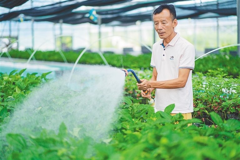 近日,在位于保亭黎族苗族自治县保城镇的海南农垦百香果种苗种植基地大棚里,有的工人在浇水(图①),有的工人正在将引进的“钦蜜9号”百香果苗嫁接到砧木上(图②)。