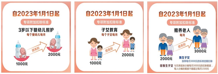 新华社北京8月31日电 为进一步减轻家庭生育养育和赡养老人负担,依据《中华人民共和国个人所得税法》有关规定,国务院日前印发《关于提高个人所得税有关专项附加扣除标准的通知》,决定提高3岁以下婴幼儿照护、子女教育、赡养老人个人所得税专项附加扣除标准。自2023年1月1日起,3岁以下婴幼儿照护专项附加扣除标准,由每个婴幼儿每月1000元提高到2000元;子女教育专项附加扣除标准,由每个子女每月1000元提高到2000元;赡养老人专项附加扣除标准,由每月2000元提高到3000元,其中独生子女按照每月3000元的标准定额扣除,非独生子女与兄弟姐妹分摊每月3000元的扣除额度,每人分摊的额度不能超过每月1500元。通知发布后,纳税人在9月份纳税申报期可按提高后的扣除标准执行,也可以在2023年度个人所得税汇算清缴时执行。