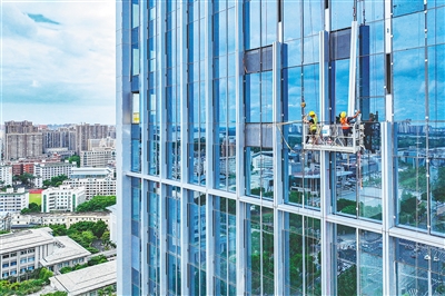 9月3日,航拍海口中交国际中心项目主楼,施工人员在进行主楼幕墙安装的收尾工作。该项目位于海口大英山CBD核心区东部延长线上,由中交二航局承建,总建筑面积13.6万平方米,包括一栋44层超高层主楼和一栋3层商业裙楼。本报记者 王程龙 摄