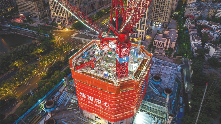 站在国兴大道抬头望去,海南中心项目主塔楼橘红色的“空中造楼机”格外引人注目,这也是最新一代“空中造楼机”首次亮相海南,该设备被视为超高层施工领域的一场“技术革命”。