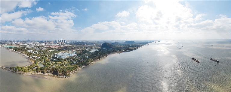 站在五山地区滨江地带远眺,江水浩浩汤汤,五山临江而立,江岸葱茏蓊郁。
