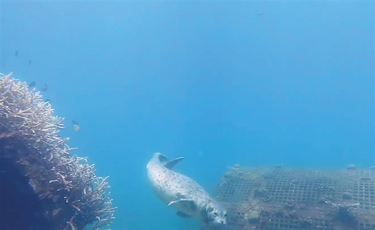 画面显示,斑海豹在蜈支洲岛海域海洋牧场的人工鱼礁间游动。专门研究海洋牧场的海南大学教授王爱民告诉海南日报记者,自己向有关的海豹研究专家、附近海洋公园的海豹饲养专家进行了求证,该海豹确为斑海豹。