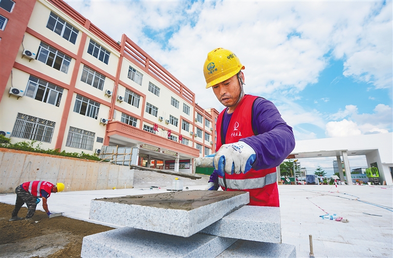 9月5日,在屯昌县大同中学改扩建项目建设现场,上百名工人加紧施工,推进工程进度。该项目计划明年6月竣工验收,9月投用。