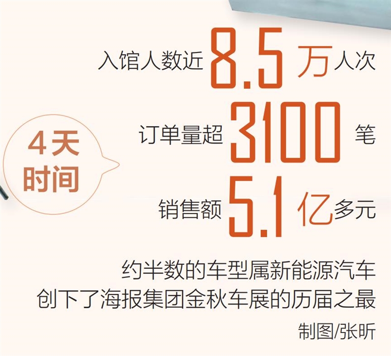 近百个品牌、千款车型参展,12款新车首秀海南……9月10日,亮点频出的2023年海报集团金秋车展落下帷幕。本届车展通过品牌展示、现场促销、采购洽谈、节目互动、福利赠送等形式不断引爆人气,为海南车迷带来了一场时尚的汽车盛宴。4天时间,入馆人数近8.5万人次,订单量超3100笔,销售额5.1亿多元。