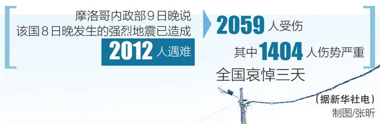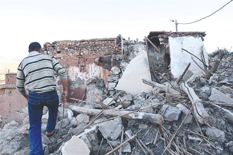 在摩洛哥马拉喀什附近,居民走在遭地震损毁的建筑废墟上。新华社发
