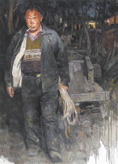 画家曹新林的作品《起五更》引起海南美术界的关注。这幅作品创作于2011年,画面描绘一个将要出门到外地拉煤的农民整装待发的瞬间,暗沉的背景中,几点微光昭示着出门的时间,而从农民的穿着,可以看出天气的寒冷,但人物坚毅的眼神,饱含一种对未来生活的坚定信念。