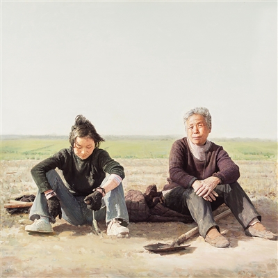 油画《乡村记之一》的画面中,右边坐着一位年长的妇女,手和脸上布满常年劳作的沧桑痕迹,左边的年轻女子,虽然穿着和城市女子一样的褪色牛仔裤、白色板鞋、黑色毛衣,但风沙与劳作,让这位女子身上沾染了浓浓的泥土芬芳——一位没有粉脂气、洋溢着青春体香、任劳任怨的健美女人的形象,跃然纸上。画家丁昆用朴实的色彩、笔触和语言,画出了朴实的河南人、朴实的河南乡村景色。