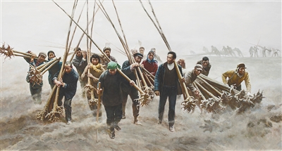 从此次展出的《红旗渠》局部作品中,可以看到画面人物的面容虽然布满皱纹,但精神状态却是饱满的。“作品的构图采取了蒙太奇表现手法,把所有的画面放在同一个平面中,体现出不同的场景。”王锐说。