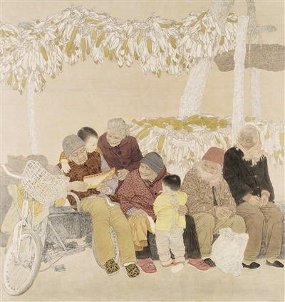 从此次画展中,可以看到河南美术脉络的延续和创新。“老一辈画家的作品更多聚焦于乡村生活,题材倾向于传统文化,表达出对现实的关怀;年轻画家则更加注重艺术形式构成的美感和画面的现代感。”王锐说。