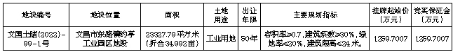 三、开发建设要求:(一)竞得土地后,竞得人须按照签订的《成交确认书》约定,在20个工作日内与文昌市自然资源和规划局签订《国有建设用地使用权出让合同》,合同签订后30天内必须缴纳全部土地出让金。(二)本次出让宗地属工业项目用地。竞得该宗土地后,竞得人须在挂牌出让成交之日起二个月内完成项目规划设计方案,具备规划报建条件,并严格按照批准的项目规划设计方案要求,以及有关部门的行业规定,在签订出让合同之日起三个月内动工建设项目、一年半内完成项目的投资建设。不按批准的项目规划设计要求进行开发建设和不在三个月内动工建设项目的,由受让人向出让人支付相当于宗地出让价款 1 ‰的违约金。受让人不履行《国有建设用地使用权出让合同》约定的,报经市政府批准后,按该合同约定,退还除该合同约定的定金以外的全部或部分国有建设用地使用权出让价款(不计利息),收回国有建设用地使用权;受让人造成土地闲置,按照《海南自由贸易港闲置土地处置若干规定》执行。(三)本次出让宗地按净地条件出让,即土地权利清晰、安置补偿落实到位、地上附着物清表、无法律经济纠纷、土地开发利用规划条件明确、符合土壤环境质量要求、符合海南省政府(琼府〔2018〕3号)文件规定具备动工开发所必需条件。竞买人应当现场踏勘出让地块,竞买人申请参加竞买的,视为对出让地块的净地条件无异议,在竞得土地后,竞得人须同意与出让人按该净地条件签订《国有建设用地交地确认书》确认出让地块交地开发建设。(四)按照《海南省建设用地出让控制指标》(琼自然资用〔2023〕12号)和《关于实施产业项目发展和用地准入协议的指导意见》(琼国土资规〔2018〕8号)有关规定,本次出让宗地工业项目用地控制指标,投资强度为不低于300万元/亩,年均工业总产值(或营收)不低于350万元/亩,年均纳税额不低于30万元/亩,达产年限5年。以上控制指标按规定列入《产业项目发展和用地准入协议》(文国土储〔2022〕-99-1号),属于协议内容的组成部分,竞得人在签订国有土地使用权出让合同时,一并与文昌市现代产业园管理委员会签订《产业项目发展和用地准入协议》。(五)竞得土地后,竞得人拟在文昌注册成立新公司进行开发建设的,应在竞买申请书中明确新公司的出资构成、成立时间等内容。(六)竞得土地后,竞得人须按规定完善该宗地施工报建、地质、压覆矿、消防、环保、土壤等审批手续,方可动工建设。(七)根据《文昌市住房和城乡建设局关于文国土储〔2022〕-99-1号地块建设项目绿色建筑等级和装配式建造意见的复函》,该地块的竞得方应采用装配式方式建造;根据《海南省绿色建筑发展条例》的有关规定,该地块的竞得方至少应按绿色建筑一星级进行设计。