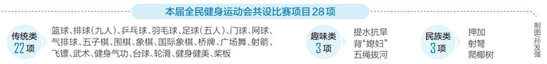 本届全民健身运动会共设比赛项目28项,其中传统类22项:篮球、排球(九人)、乒乓球、羽毛球、足球(五人)、门球、网球、气排球、五子棋、围棋、象棋、国际象棋、桥牌、广场舞、射箭、飞镖、武术、健身气功、台球、轮滑、健身健美、桨板;趣味类3项:提水抗旱、背“媳妇”、五绳拔河;民族类3项:押加、射弩、爬椰树。