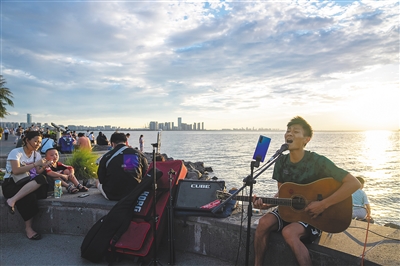 落日余晖下,习习海风不再裹挟着热气,海水也披上了金色的外衣,呈现出与白天截然不同的海边光景。海口外滩有许多临海餐厅,坐在露天阳台上,感受着海风的吹拂,眺望远处亮灯的世纪大桥上车来车往。伴随着海洋独特的气息饱餐一顿,不失为一种海南特有的浪漫。
