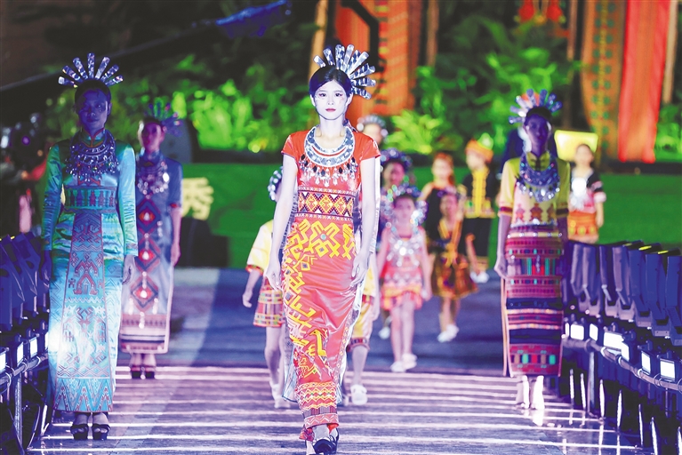 9月16日晚,五指山市民族时装“村秀”系列文化活动在该市通什镇小岛公园启幕,市民游客欢聚于此共享民族文化和非遗盛宴。来自畅好乡的20位村民身着丰富图纹和鲜明热烈色彩的传统黎族服饰、“桫椤”服装等展示了当地的民族文化、特色。
