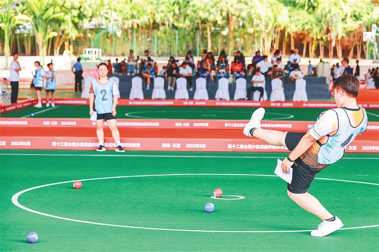 比赛在群山环绕的三亚学院风雨球场举行,球场经过精心改造。海南日报记者注意到选手们斗智斗勇,每个人手上都拿着一张对线图,出脚前左看右比,后倾身体仔细瞄准,然后用前脚掌果断出击,选手击中远球都迎来阵阵叫好声。
