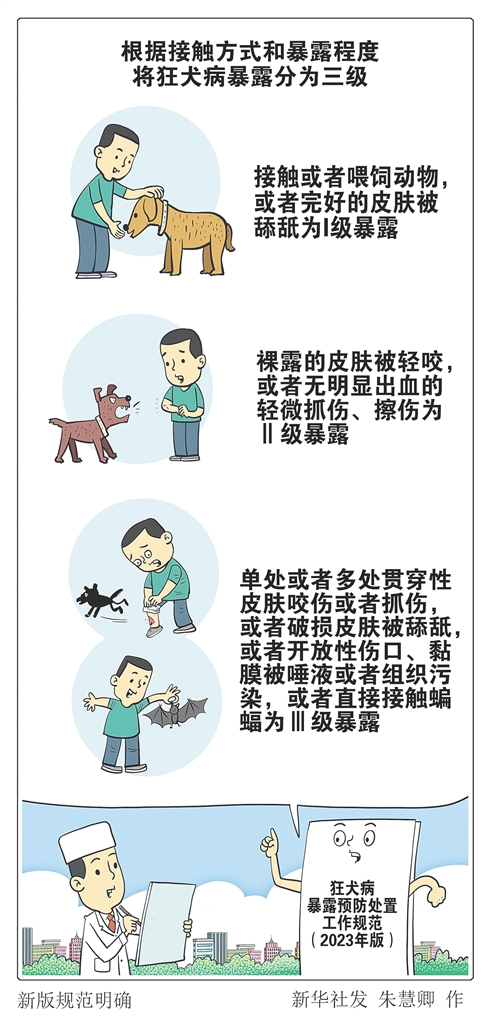 新版规范明确,根据接触方式和暴露程度将狂犬病暴露分为三级:接触或者喂饲动物,或者完好的皮肤被舔舐为I级暴露;裸露的皮肤被轻咬,或者无明显出血的轻微抓伤、擦伤为Ⅱ级暴露;单处或者多处贯穿性皮肤咬伤或者抓伤,或者破损皮肤被舔舐,或者开放性伤口、黏膜被唾液或者组织污染,或者直接接触蝙蝠为Ⅲ级暴露。