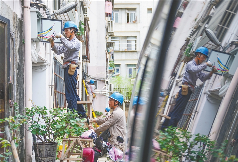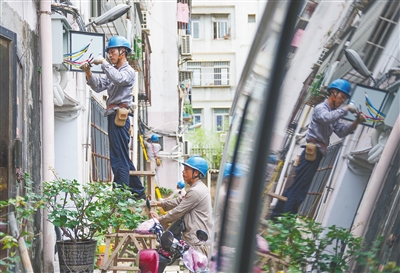 9月16日,在海口龙华区城西镇金盘路的一个老旧小区内,电力工人正在安装线缆,对小区的电路进行改造。该小区改造完成后,将实现电力抄表到户。