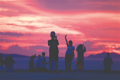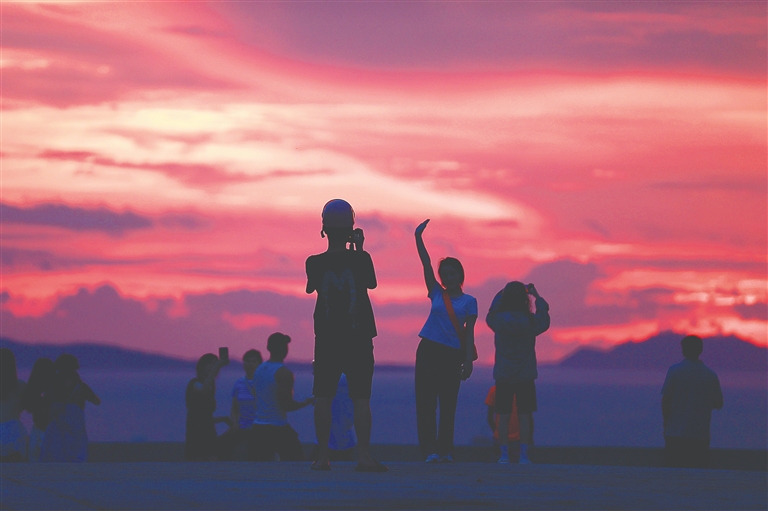 近日,傍晚时分,三亚鹿回头观海平台,晚霞美艳动人,整个天空被绚烂的色彩覆盖,从橙红到深紫,色调交相辉映,犹如一幅美丽的风景画,吸引众多市民游客驻足观赏,拍照留影。