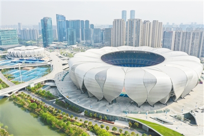 被市民称为“大莲花”的杭州奥体中心体育场位于钱塘江畔。场馆造型设计灵感源自古老丝绸纹理与编织体系,建筑体态设计灵感源自钱塘江水的动态韵律。“大莲花”外表由28片“大花瓣”和27片“小花瓣”构成,状若一朵绽放的白莲花。场馆内的座椅从东到西颜色逐渐从紫色变为蓝色,寓意“紫气东来”。