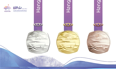 奖牌“湖山”正面以凸出的线条勾勒出“西湖十景”中的断桥和三潭印月,文化味十足。奖牌绶带顶端的束扣上有京杭大运河拱宸桥的形象,古往今来运河通达,杭城商贾云集,运河文化基因生生不息。