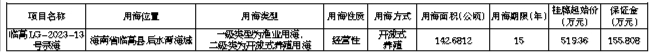 二、交易方式:根据受让方征集情况,确定交易方式,若只征集到一名意向受让方,采取挂牌方式交易;若征集到两名及以上意向受让方,采取现场拍卖方式交易。三、竞买人资格与要求:中华人民共和国境内的法人、自然人或其他组织满足以下条件的均可报名参加竞买(除法律、法规另有规定的除外),申请参加竞买者须提出书面竞买申请,并按照要求提供相关材料。提供不低于人民币100万元、在公告期间的银行资信证明。须缴纳履约保证金155.808万元。四、保证金缴纳:以2023年10月18日17:00前到账为准,保证金账户名称:海南省公共资源交易服务中心;开户行:建设银行海口国兴大道支行;账号:46050100253700000245。五、挂牌文件获取方式:申请人可于2023年10月18日前到海口市滨海大道123号鸿联商务广场3层咨询和购取挂牌出让手册,并按要求报名参加竞买。六、公告、报名、挂牌期报价、现场会时间及地址:(一)公告时间:2023年9月19日至2023年10月18日;(二)报名时间:2023年9月19日8:30至2023年10月18日17:00(以竞买保证金到账为准),经审核,申请人具备申请条件的,我局将在2023年10月18日17:30前确认其竞买资格;(三)报名地址:海口市滨海大道123号鸿联商务广场3层;(四)挂牌期报价时间:2023年9月19日8:30至2023年10月20日09:30;(五)挂牌现场会时间:2023年10月20日09:30;(六)挂牌现场会地址:海南省政府会展楼二楼省公共资源交易中心202室。七、其他事项:(一)本次竞买活动挂牌报价阶段只接受书面报价,不接受电话、邮寄、电子、口头等其他方式报价;(二)本次挂牌出让事项如有变更,以届时变更公告为准;(三)本公告未尽事宜详见本次海域使用权挂牌出让手册,该手册所载内容为本公告的组成部分;(四)联系电话:0898-36287001、18976947136。