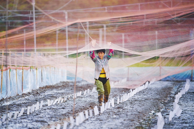 9月18日,陵水安马洋国家南繁科研育种基地,在此务工的当地村民在田间支鸟网,防止实验材料被鸟儿啄食。