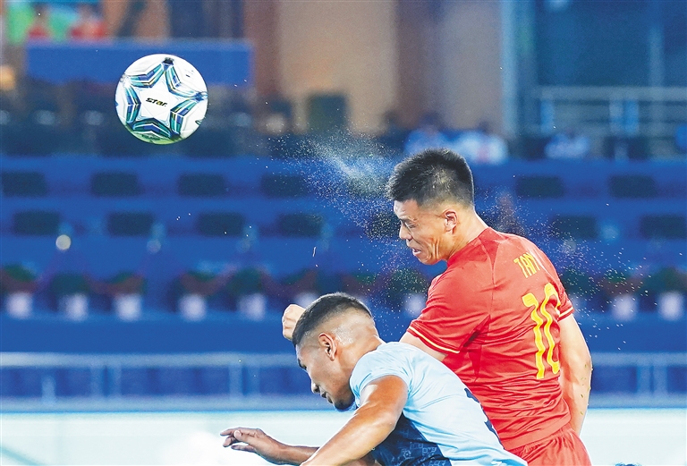 9月19日晚,在杭州亚运会男子足球小组赛A组首轮比赛中,中国队以5比1大胜印度队。上半场比赛高天意破门,印度队坎诺利扳平。下半场戴伟浚远射破门,陶强龙梅开二度,方昊锦上添花。图为中国队球员谭龙(右)在比赛中头球攻门。 新华社记者 杜宇 摄