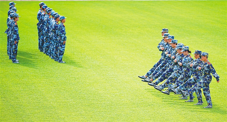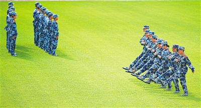 近日,海南体育职业技术学院新生在教官指导下开展训练。据了解,该校除通过队列、方阵等课目训练外,还结合国防知识教育等内容,让学生在增强体质,锻炼吃苦耐劳和团队协作精神的同时丰富国防知识,增强纪律观念,磨炼意志品质。本报记者 张茂 摄