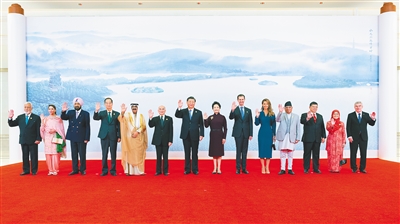 秋日漪园,水光潋滟,丹桂飘香。习近平和彭丽媛热情迎接贵宾,同他们亲切握手并合影留念。