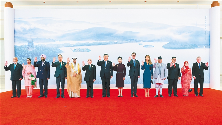 新华社杭州9月23日电(记者袁震宇 杨依军)9月23日中午,国家主席习近平和夫人彭丽媛在浙江省杭州市西子宾馆举行宴会,欢迎来华出席杭州第19届亚洲运动会开幕式的国际贵宾。