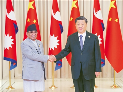 习近平指出,中国和尼泊尔山水相连、世代友好。建交68年来,两国坚持和平共处五项原则,树立了大小国家平等相待、合作双赢的典范。中尼在实现国家发展繁荣的道路上互为伙伴、互为机遇。中方高度重视中尼关系,愿同尼方加强发展战略对接,推动中尼关系不断取得新进展。