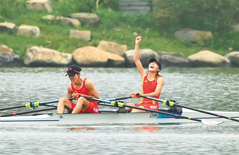 9月24日,邹佳琪(右)/邱秀萍在夺冠后庆祝。当日,在杭州亚运会赛艇女子轻量级双人双桨决赛中,中国组合邹佳琪/邱秀萍以7分06秒78的成绩夺得冠军,斩获本届亚运会首金。(更多报道见A12版)新华社记者 江汉 摄