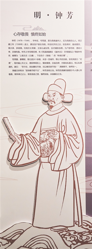 出生于明成化十二年(1476年)的钟芳,是从崖州高山所(今三亚市崖州区高山村)走出的一代名臣,被誉为“上继文庄(丘濬),下启忠介(海瑞)”之人。钟芳学问精深,时人称他“为学博极而精,虽律历医卜之书,靡不贯通”。钟芳曾在闽、浙、桂、赣等地为官,官至南京太常寺卿、户部侍郎。他为官清廉、刚正不阿,主张礼诚仪简,反对铺张浪费,对贪赃枉法、行贿受贿等行为尤为痛恨,一旦发现,便立即严加惩处。他晚年致仕居乡,很少出门,常以书史自娱。有人以私事请托,他回绝道:“吾守志,犹如嫠妇守身,岂以晚而改节哉!”
