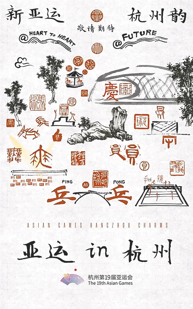 在“新亚运,杭州韵”主题宣传片——《亚运In杭州》中,中国书法元素更是发挥得淋漓尽致。一支由篆刻、书法、国画等中国传统艺术元素联袂呈现的创意动画片,以金石篆刻的印章作为故事的主角,发挥中文象形文字的传神表意功能,以印章为载体,展现了马术、排球、足球、霹雳舞和乒乓球五个亚运项目,刻画杭州亚运会带给人们的温暖和独特的“印记”。标题中的“In”音同汉字“印”,亦在彰显“亚运在杭州”的别样韵味。纵览全片,在明快的节奏烘托下,每一个简短而生动的小故事,既是“品牌亚运”作为亚运重要筹办目标的真实写照,也凸显了杭州亚运会对居民、城市和未来发展的深远影响。
